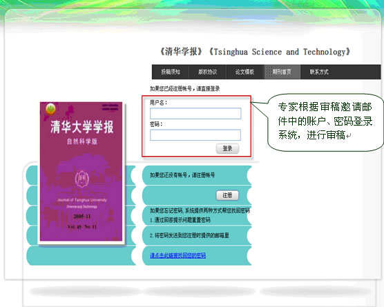 在编辑部采编工作区输入用户名、密码(获取用户名和密码请联系中国学术期刊电子杂志社),点击“登录”, 进入专家审稿区界面。
