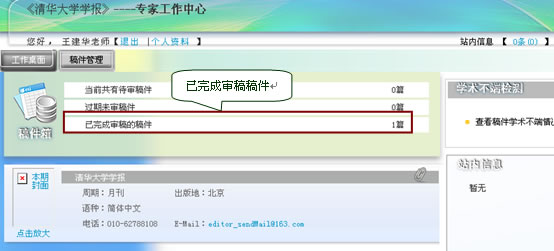 完成审稿后,专家的“已完成审稿的稿件”数量增加1篇: